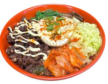 A Korean inspired bowl with kimchi,seaweed,mushroom and vegetables with egg and beef with a touched of lightly spiced gochuchang sauce and mayo garnished with Spring onion