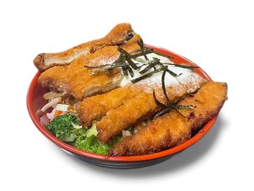 Chicken cutlets simmered with donburi sauce topped with egg over bed of rice