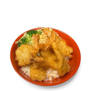 Deep fried tempura shrimp served on a bed of rice and mixed veggies with a side of tempura sauce