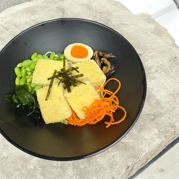 Miso broth Ramen with toppings of Fried tofu & Ajitama with finest veggies on ramen style noodles