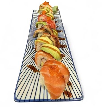 Rolled sushi with cucumber ,crabstick and mayo covered with slices of tuna,salmon,unagi,ebi shrimp,avocado garnished with tobikko and drizzled with unagi sauce