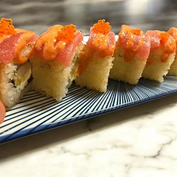 Deep fried Sushi roll filled with tempura and cream cheese topped with tuna garnished with tobikko and drizzled with lava sauce