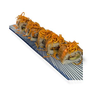 Sushi roll with mayo ,avocado ,crispy ,unagi wrapped with inari and topped with sweet potato crunch with added flavour of sweet chili and spicy mayo