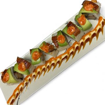Sushi roll filled with tempura,crabstick,cucumber and mayo covered with unagi and avocado dotted with lava sauce with tobikko drizzled with s.mayo and unagi sauce