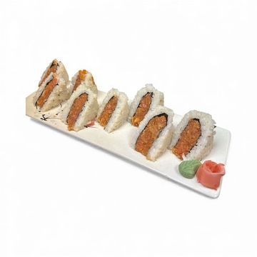 Indulge in the perfect fusion of flavors with our Tuna Salmon sushi Sandwich shape sushi. Handcrafted sushi sandwiches with a touch of mayo amd spicy mayo added with caviar and crunchies with hint of spice, accompanied by traditional Japanese condiments.